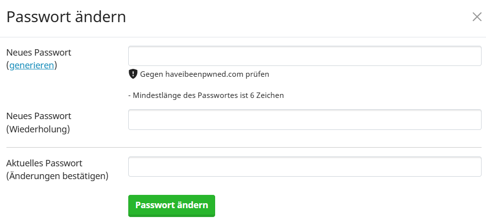 Nach erfolgreichem Login werden Sie aufgefordert, ein neues Passwort für dieses Account zu vergeben. Dieses Passwort wird jenes sein, mit welchem Sie zukünftig Ihre E-Mails abrufen können - nutzen Sie daher bitte ein starkes Passwort bzw. nutzen Sie ggf. die Option generieren: